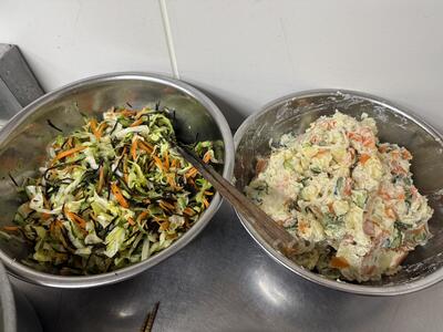 車麩の衣のコロッケ 豆腐マヨネーズのポテトサラダ ひじきとレタスのサラダ 柿の葉の天ぷら