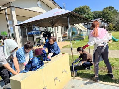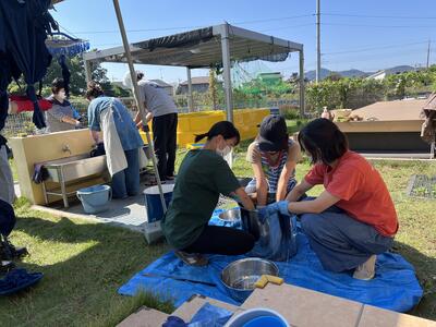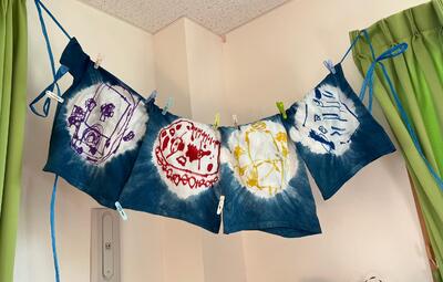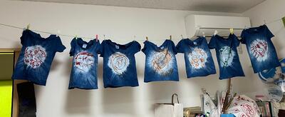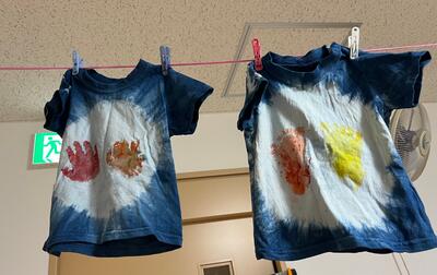 皆んなでおしゃべりしながら 初参加のママも ベテランママも 楽しくワイワイ Tシャツや手拭い 小物を染めました