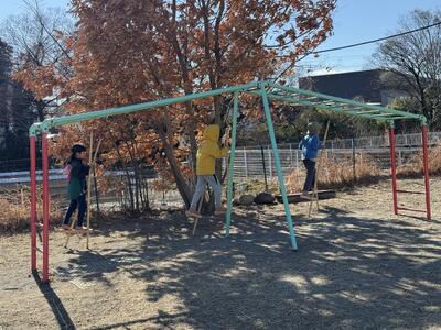 豆が柔らかくなるまで 約2時間 その間は 庭で竹馬 壁が無くても乗れるようになってきた 凄いね