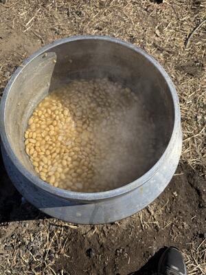 先ずは羽釜で 大豆を煮ます