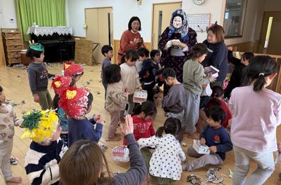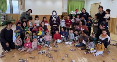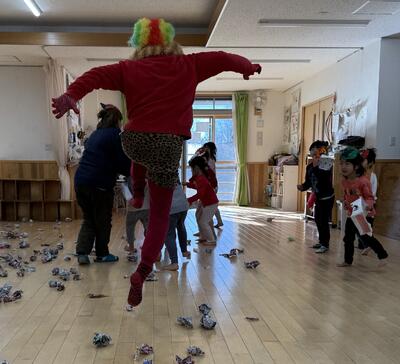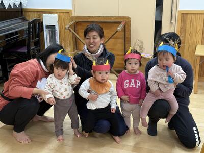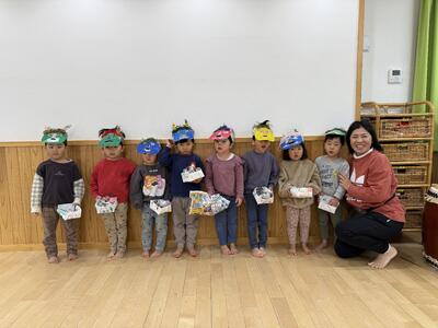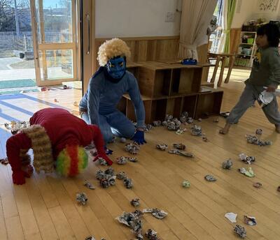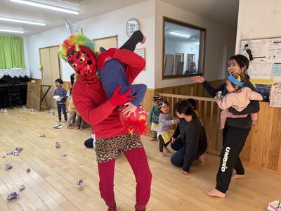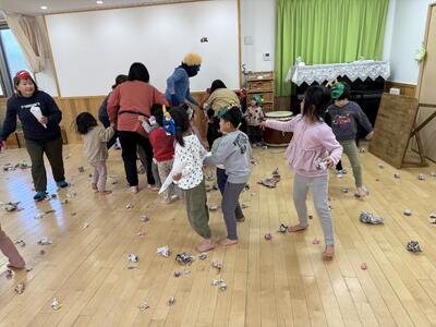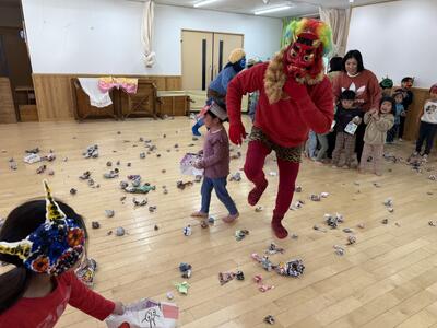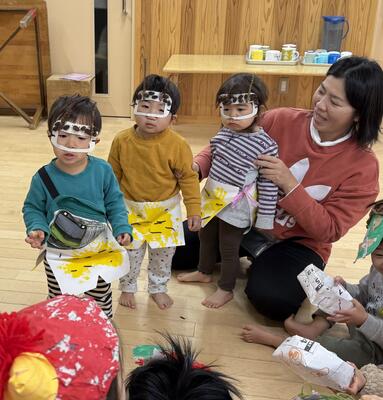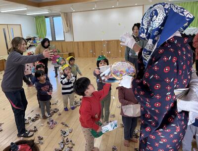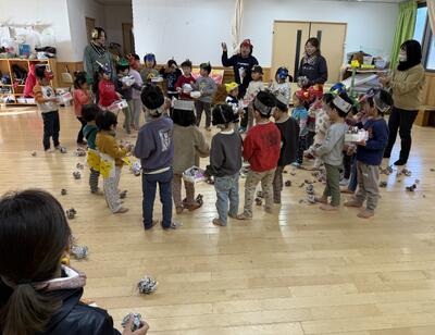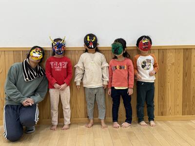 節分 豆まきの日が来ました クラス毎に 手作りをしたお面を披露して 「強いぞー」と意気込むこども達