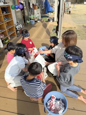 節分 豆まきの日が来ました クラス毎に 手作りをしたお面を披露して 「強いぞー」と意気込むこども達